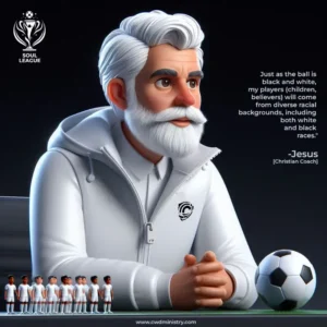 God [The Referee] plays by the rules for a fair match in the soul league, limiting fouls and instructing the players to refrain from any. He engages in the game with righteousness and truth, involving players from every race and tribe on Earth, just as the ball is a blend of both white and black. Jesus is the Coach of the Christian Team, he trains, builds and buy players (through his blood) from all around the world.